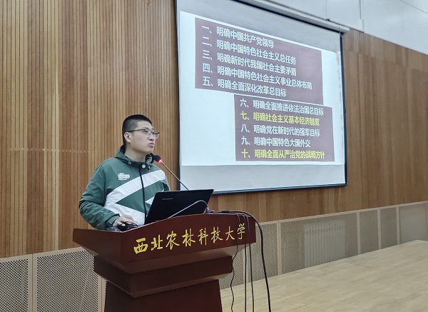 商晓辉老师以“深入学习贯彻党的二十大精神”为题,从二十大的历史地位、主要内容、核心要义、实践要求等方面进行了系统全面的解读。他用生动形象的语言和丰富的案例,深入浅出地阐述了党的二十大精神的重大意义和指导作用。结合公司专业建设和学科特点,他鼓励入党积极分子坚定理想信念,增强使命担当,勇于创新创造,秉承“扎根杨凌、胸怀社稷;脚踏黄土、情系三农;甘于吃苦、追求卓越”的“西农精神”,积极投身“三农”事业,为全面建设社会主义现代化国家,全面推进中华民族的伟大复兴而团结奋斗。