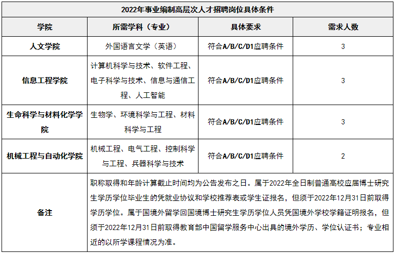 详见《2022事业编制高层次人才招聘岗位具体条件》(附件1)