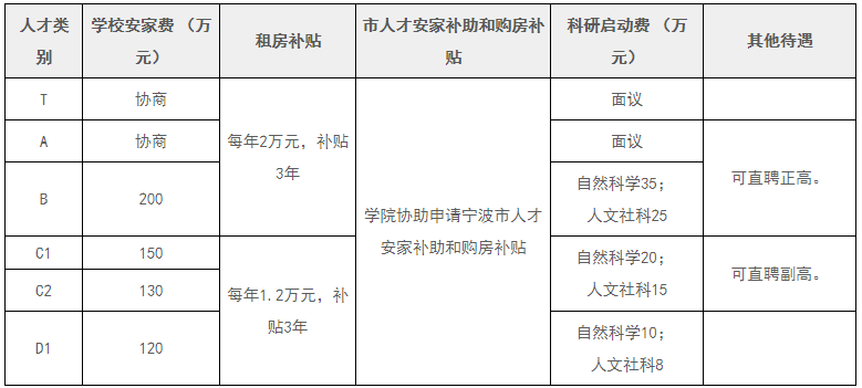 此外,根据《宁波市人才安居实施办法》,2018年10月11日之后从宁波市外全职新引进的高层次人才,在宁波大市范围内首次购买家庭唯一住房的,可享受实际购房总额20%,最高20-60万元的宁波市购房补贴(引进前在甬购房,无法享受购房补贴);另外根据相应人才类别,还可享受15-800万元的安家补助。