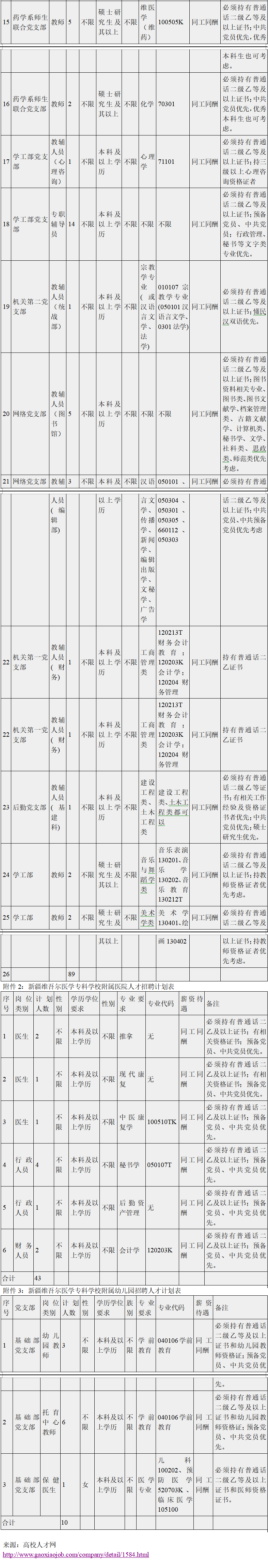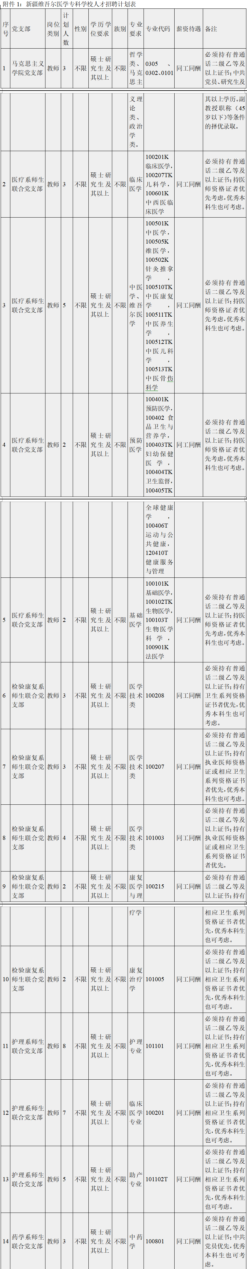 附件1:新疆维吾尔医学专科公司人才招聘计划表(附后)