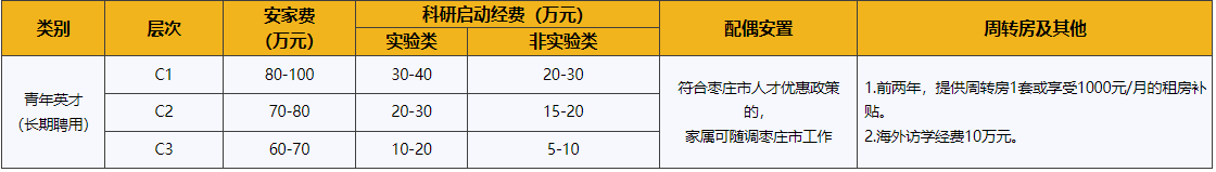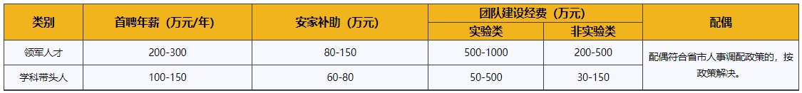 全职引进人才实行年薪制,公司在聘期内提供安家补助、团队建设经费、周转房等优惠政策,具体标准“一人一议”、“一事一策”。标准详见下表: