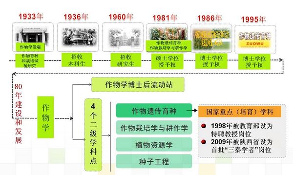 本学科先后选育了90多个小麦品种,代表品种有碧蚂1号、小偃6号、丰产3号,陕农7859、小偃22和西农979,引领了黄淮麦区4次品种更新换代,累计推广面积18亿亩,为国家粮食安全做出了巨大贡献;主编的全国统编教材《作物育种学》、《农业自然资源利用与区划》影响了数代学子;小麦杂种优势利用、旱作农业和小杂粮研究处于国际先进水平;具有自主知识产权的作物根系研究装置2015年入选美国土壤学大百科全书;2012年牵头与中国农业大学、华中农业大学联合筹建了具有国际水平的“小麦生物学创新平台”;创办的《麦类作物学报》、《干旱地区农业研究》、《西北农业学报》为学科发展提供了重要的交流平台。