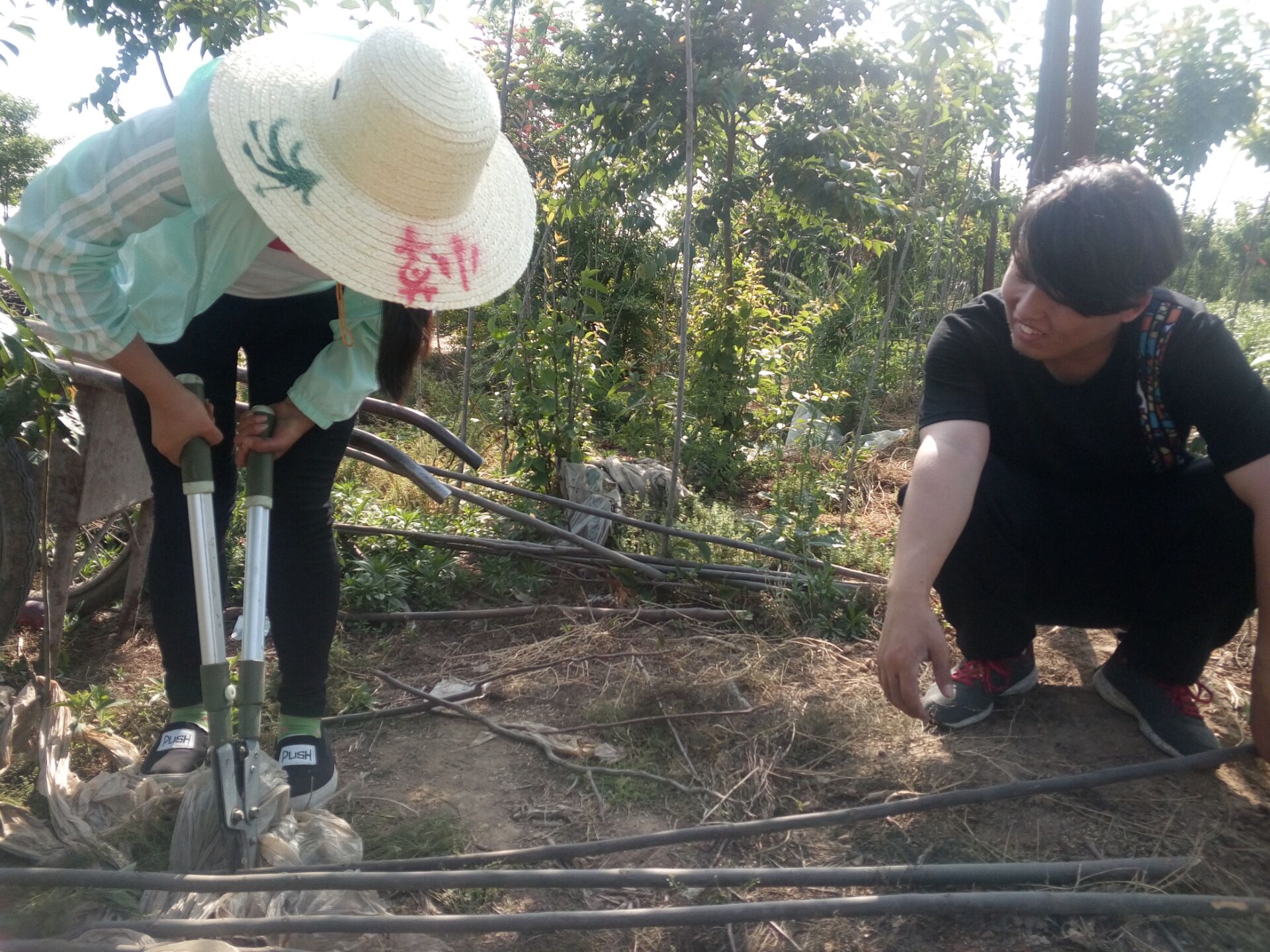 到达目的地后,敬爱的合作社负责人--罗先生很热情的为队员提供手套、水和一些设备后向大家详细介绍并演示修枝剪用法、固定樱花苗木的方法,提醒注意事项。队员们认真聆听并做着笔记,实践时也在不断摸索最佳固定方式,矫正长弯的树苗让它更直更好。用木棍和绳子将部分长歪的樱花苗木进行固定的工作结束之后,使者们又对大棚里的葡萄苗进行固定,以便将来它们能沿着竹棍长上去。在工作过程中,队员们一边交流讨论,一边固定苗木,掌握了技能,增进了友谊,获得了快乐。