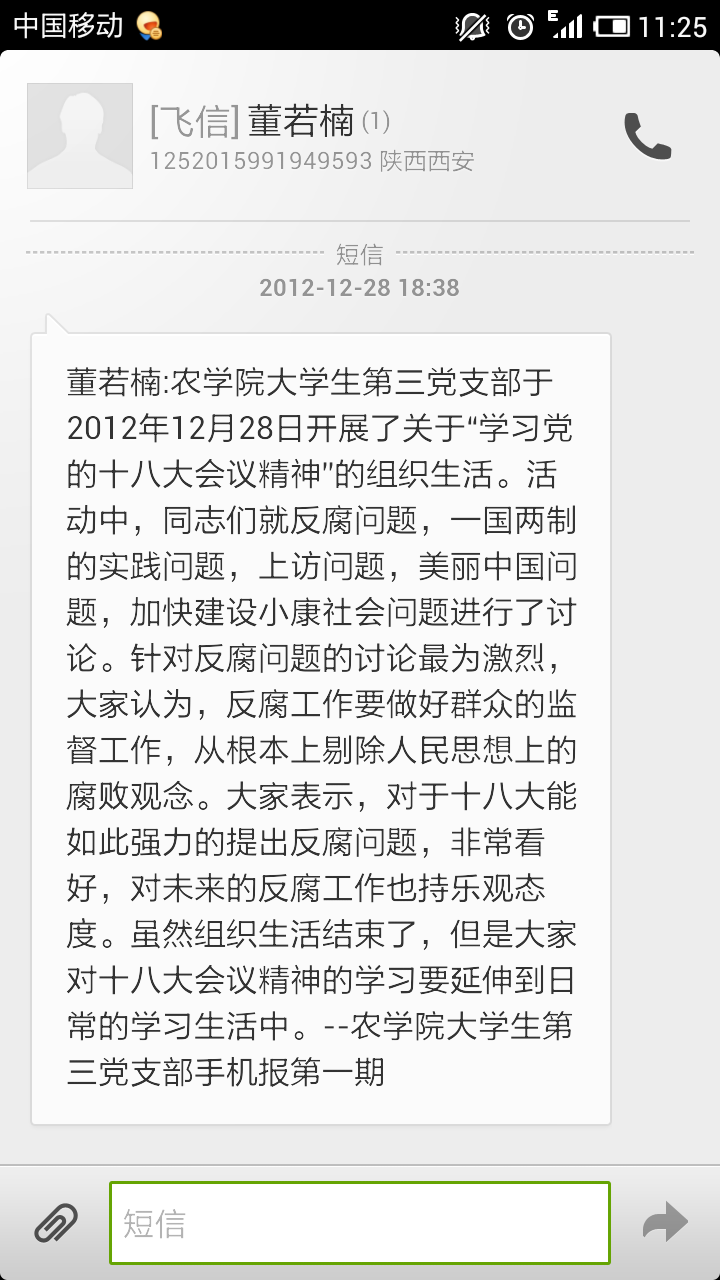 在十八大召开以后,365上市集团官网老员工第三党支部便通过手机以手机报的形式向各位同志及时发布十八大会议信息,使每位同志持续学习十八大会议精神,将十八大精神和学习十八大的学习讨论会的会议要点和学习重点,传达到每个员工的手中,将十八大精神引入每位员工党员的学习生活中去,组织员工的热议国家大事,不断增强自身的民族自豪感,