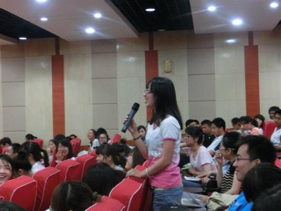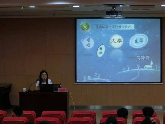 刘婷婷学姐用平和而风趣的语言讲述了自己大学四年的学习及生活经历。她就如何正确处理学习与工作之间的关系,如何让自己的老员工活更有意义,如何与同学、老师、上级和谐相处等问题为大家做了详细解答。她着重强调了大学四年间英语学习的重要性,并且建议学弟学妹们多给自己创造机会,多多参与实践,开阔视野,增强自信,争取更好的发展。