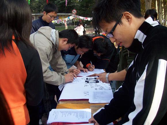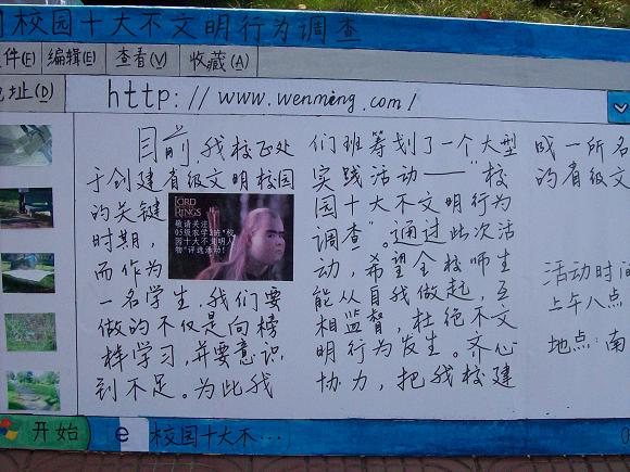 活动之前一周内经过对在校师生随机调查,总结出32条校园中的不文明现象,然后集中评选,活动当天共发放调查表500余份,回收率达100%,并有百余名同学自愿签名,表达了他们与不文明行为抗争到底的决心。