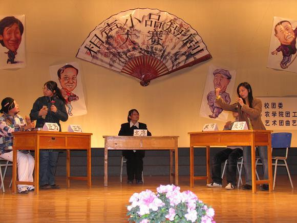大赛会场上气氛异常激烈,观众位上座无虚席,大赛节目精彩连连,观众们更是掌声不绝,笑声不断,一脸的兴奋与快乐,一扫平时学习压力所带来的忧愁。《白毛女之大学英语四级》,地主与贫民的概念作了重新界定,能力四级与证书四级作了鲜明对比,捧腹大笑之余也引人深思;专业相声《报菜名》,将经典重新演绎,不失其原汁原味;《扫地》一事扯出了文明校园如何做文明老员工,事小意大,发人深省;《唐僧收徒之猪八戒》,无厘头的经典式搞笑,令人笑破肚皮;《五号病房》里发生着市民与农民之间的故事,虽是哑剧,但也将城乡差别,农民与市民间的矛盾表现的淋漓尽致,在大笑的同时,心里不禁有了一种沉甸甸的感觉。这些节目贴近了我们的生活,反映了社会现实,在表演上大家也是八仙过海,各显神通,使同学们有了一种感同身受的感觉。