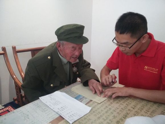 很多八九十岁高龄的老兵,虽然耳聋眼花,但在看到整齐划一的阅兵仪式时仍热泪盈眶地敬着军礼。在老前辈的房间里,同学们看到老人装在盒子里的荣誉勋章,聆听他们讲述红色故事。89岁的同景飞老人年仅13岁就加入了八路军队伍,参加过许多战役,荣获纪念抗日战争胜利70周年等纪念章。老前辈说:“每一个军功章都是一段惊心动魄难以忘怀的回忆。延安保卫战,特务连一起出去一百三十多人,仅仅回来五个,现在活着的只有我。”并给同学们展示了横贯手臂的一条弹痕,那长长的疤痕诉说着过去生活的艰辛,今天幸福生活的不易。老人回忆起南泥湾开荒的情景,感慨道:“自力更生艰苦奋斗,是延安精神才让延安变化这么大!”;86岁的刘泽明老人1944年3月加入了西北野战军353旅宣传队,1947年加入中国共产党。老前辈热爱生活,活到老学到老,桌子上还压着自己学习的党的精神政策。老人关注时事,爱英语爱陕北民歌。老前辈还积极热情的带着同学们参观了敬老院,并指着墙上的一幅《沁园春 雪》说:“数风流人物,还看今朝!今朝就是你们呀!”