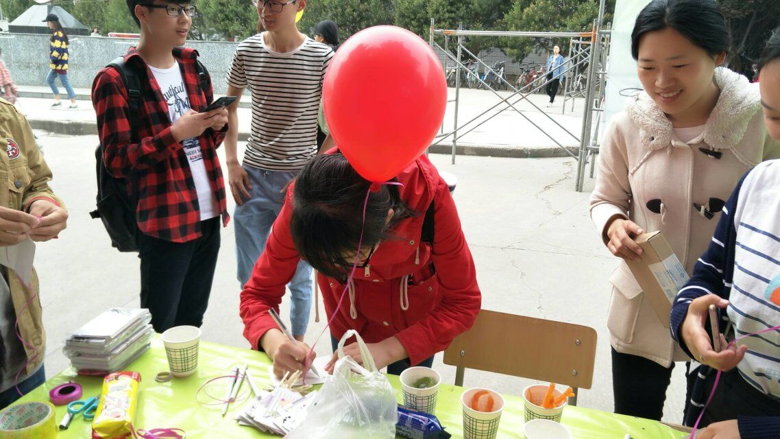 在活动开始之前,心咨部同学们准备气球,放好零食分享给将要写下心愿的同学们。活动开始后反响异常热烈,同学们纷纷来到桌子前领走气球写下自己的心愿。准备气球的心咨部同学一刻不停,大家的积极参与让气球“供不应求”,活动刚刚开始一小时我们准备的氦气就已经不够用了。视线所及之处都是拿着气球的同学们,看着他们脸上的笑容,心咨部的同学们也非常高兴能够带给他们快乐!