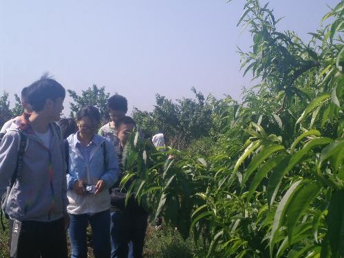 由于是第一次来到合作社,合作社负责人首先带领队员们参观了合作社的果园并介绍了相关情况。杨凌秦鲁大鹏桃专业合作社占地约100亩,主要种植各个品种的桃,总产量很大,但是没有固定的的销售渠道。合作社负责人在介绍提到:“现阶段合作社主要在进行桃树的疏果,主要是保证桃子产量的稳定。桃最快在六月份即可收获,收获之后,合作社会根据市场情况种植桃类苗木,以达到经济效益最大化。”在参观完之后,两支队伍的队长与合作社负责人关于日后活动的开展进行了深入的交谈并达成基本共识:合作社安排并指导田园使者队伍进行相关工作,而两支田园使者队伍定期前往合作社完成安排的工作并为合作社提供一定的技术支持。