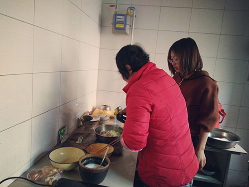包饺子的计划暴露,孟阿姨又惊又喜,却还是开始忙着为志愿者们打扫出厨房。志愿者们也开始投入忙碌中,洗菜、和面、调料,大家都兴致高昂。这是志愿者们第一次包饺子,笨手笨脚的志愿者们让孟阿姨又欢喜又心疼,也跟着忙活起来。孟阿姨做军师指导,志愿者们则听从命令行动,加盐,加油、加大葱,厨房里真是好一阵热闹。擀饺子皮是一个技术活,这对曾经在饭店工作过的孟阿姨来说根本不算事,三五分钟几十个圆圆的饺子皮就已经擀好了,志愿者们目瞪口呆,然后笨拙地包着饺子,各式各样的饺子在抹了油的大盘子里一个一个的排着整齐的队伍,一会功夫,饺子皮已经包完了,志愿者们便迫不及待地等待着饺子下锅。
