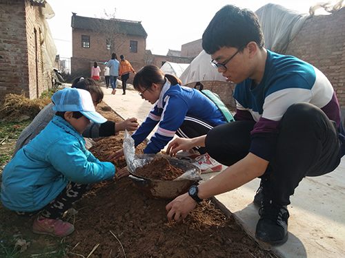 志愿者们与孩子们一起松土
