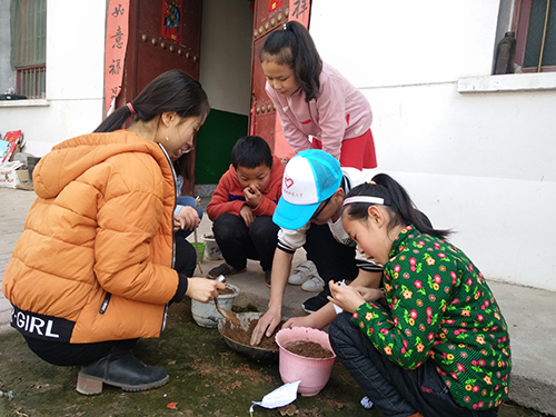 听完志愿者的讲解,小朋友们对种植植物更加感兴趣,纷纷拿出准备好的工具,握着种子,牵着志愿者的手,前往村外土地肥沃之处挖掘土壤。不一会,志愿者和小朋友们便带回了好几盆沃土。在志愿者的帮助下,小朋友在备好的花盆里装上三分之二的土壤,挖出一个小坑,将种子撒进花盆里,再在其上覆上一层薄薄的略干的土。如此,一盆植物便播种好了,只待夏日到来,万花盛开。当然,期间定少不了小朋友们悉心地灌溉照料。