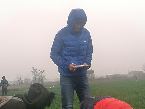 放眼望去,麦田里一片郁郁葱葱的绿意,小麦长势喜人。杂交组的成员们正聚集在自己的麦田,不顾风雨,专心致志地数着分蘖数。本在大家出发的时候是淅淅沥沥的小雨,渐渐雨滴却大而密起来。但大家已经顾不上拿伞了,手因为拨动麦苗沾满了雨水和泥土,脚上也踩了满脚的泥,但大家最关心的是,尽量保护脚下的麦苗不受伤害。长达一个多小时,大家中午将一亩多的四块田地小麦春季分蘖数分别统计记录清楚,完成了今天的任务。