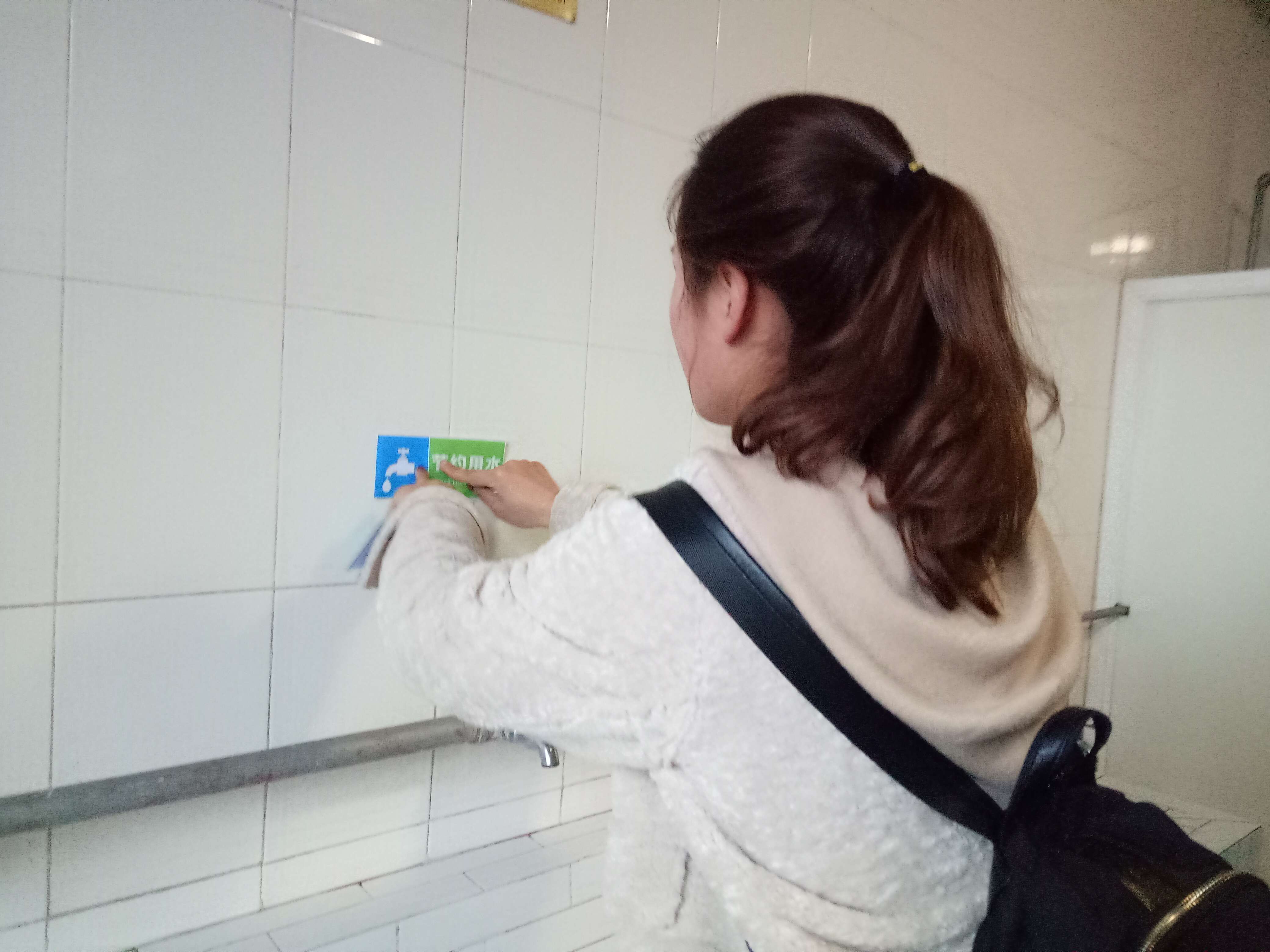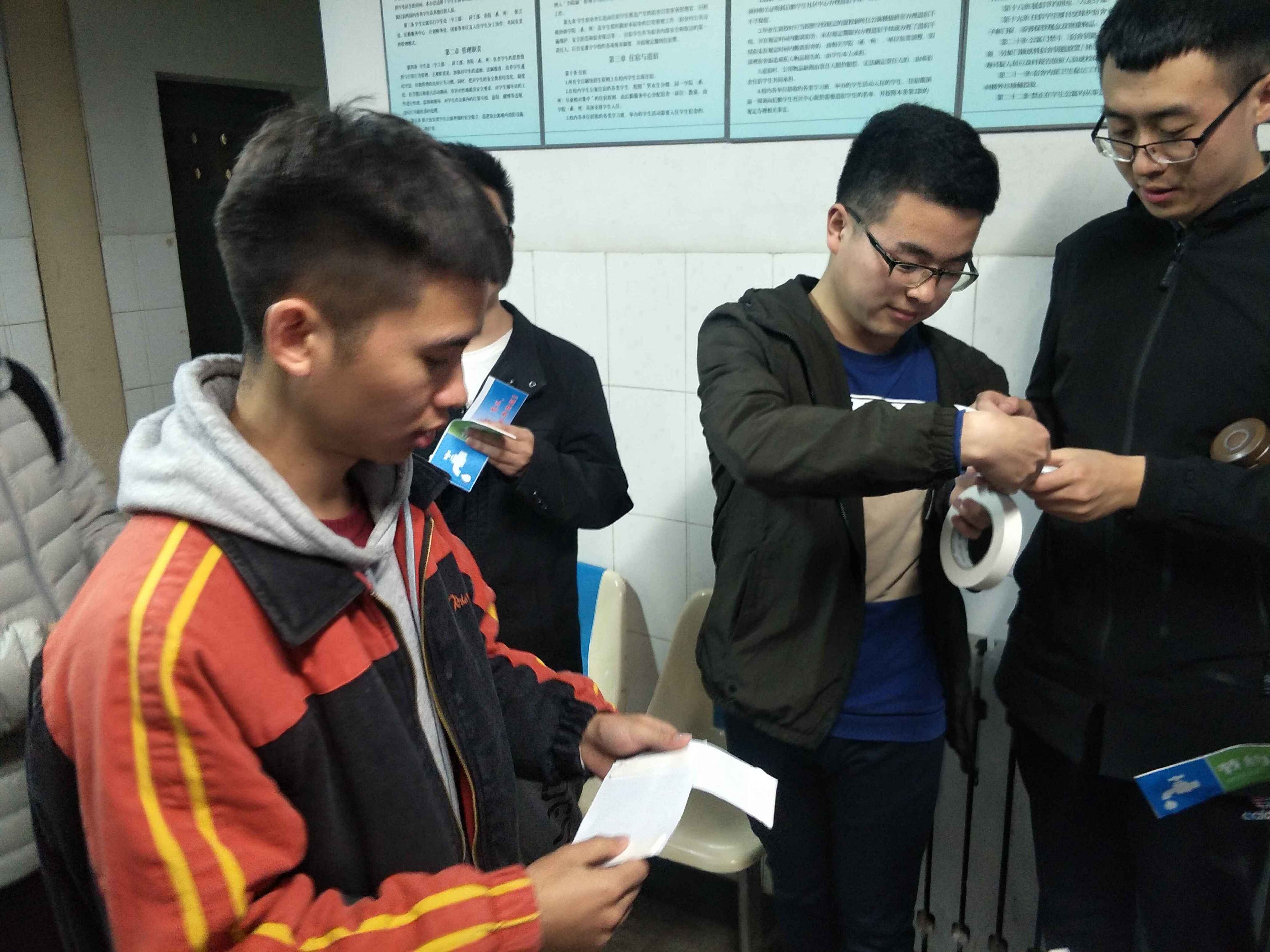 为了完成此次活动,同学们下午六点半准时来到西区雕塑处集合,社践委员为大家分配了各自的任务——在宿舍楼中张贴节水标语;同学们拿着标语来到了各自的宿舍楼,随后便热火朝天地干起了自己的工作。虽说只是张贴一张标语,可同学们依然以自己最大的热情去完成着。