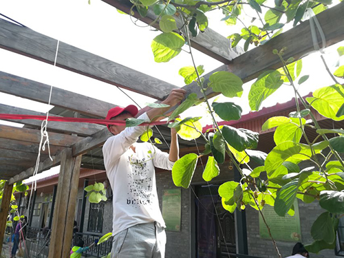 同学们为猕猴桃树绑线