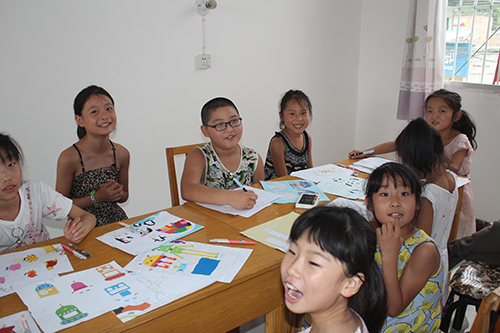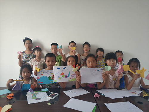 下午三点,队员们怀着既忐忑又期待的在村委会门口等待,担心的是之前的宣传是否做得好。当看到一群小朋友蹦蹦跳跳走来时的候,队员们心中的一块大石总算落了地。来到教室,按照之前的计划,先是辅导孩子们的暑假作业,不过很多孩子的作业已经做完了,剩下的就是检查作业了。这部分完成之后,队员们拿出绘画用品,和充满想象力的孩子们一起画画,用小小的画笔,画出心中精彩的世界。
