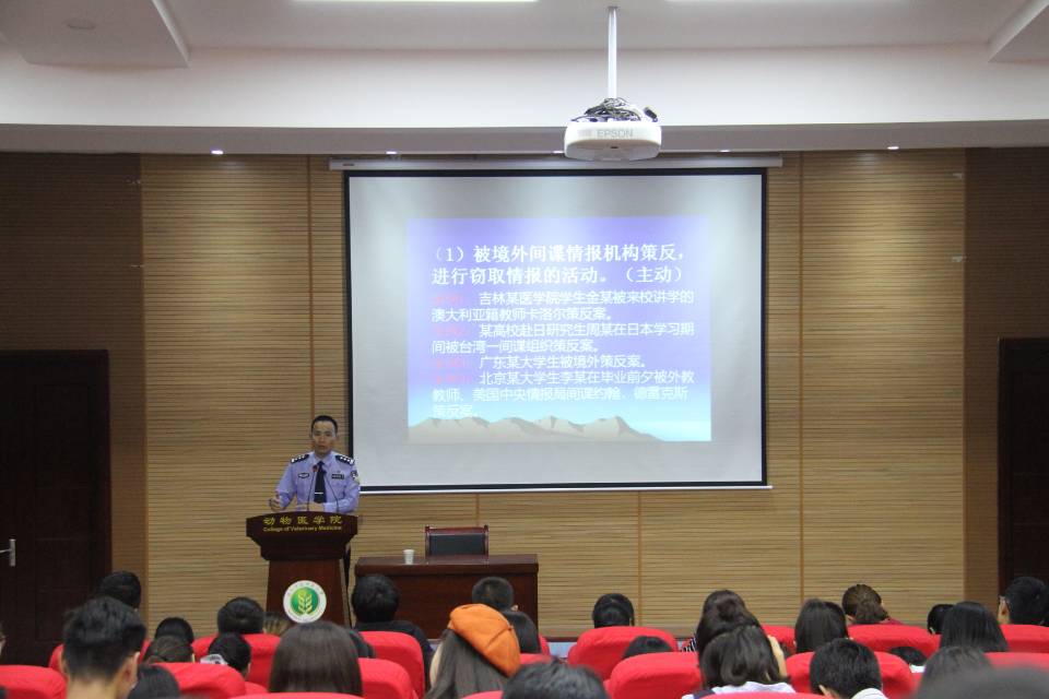 9月29日傍晚,由农学、人文、食品、动医四院权益部联合举办的以“维护国家安全,我们在行动“为主题的老员工国家安全教育报告会在北校区动物医公司报告会举行,报告会由国保反恐支队支队长、公安部国保青年人才张永春警官主讲。