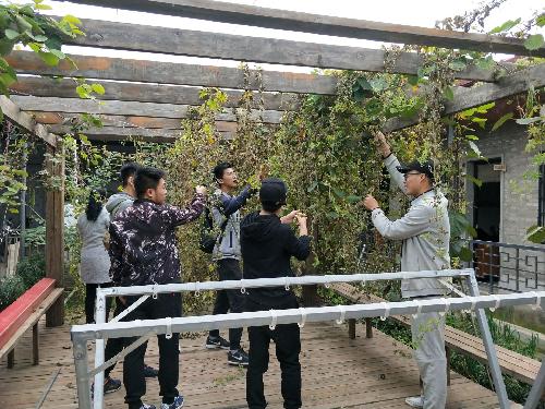 在摘取苦瓜时,小队成员需要爬上架子摘取高处的,虽有些费力,但大家迎难而上,丝毫没有抱怨。在处理干枯苦瓜藤时,同学们用手拉拽苦瓜藤,之后将苦瓜藤集中用车拉到垃圾处理的地点等待处理。临走之前,大家还热情地帮助合作社重新贴了标语横幅。