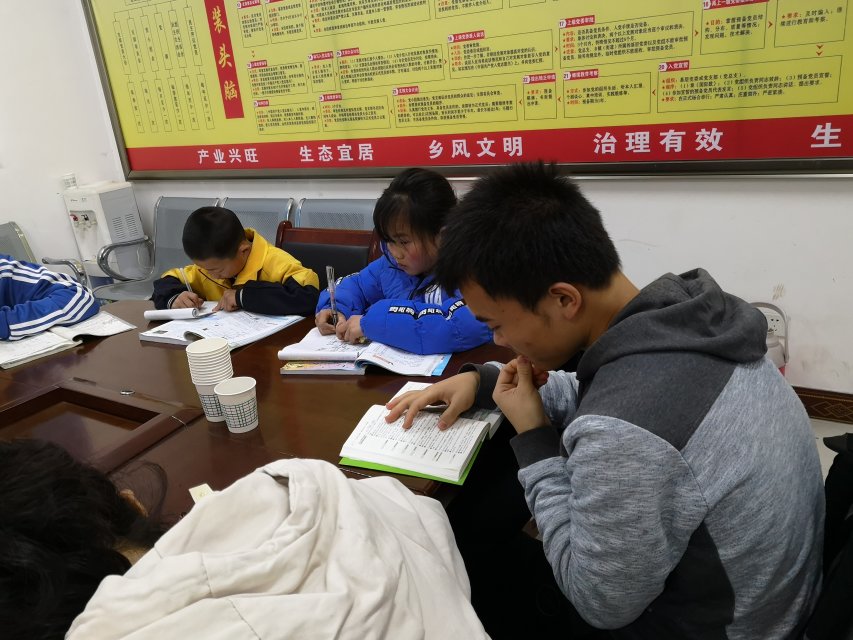 在互相介绍完后,就进入了正式的辅导环节。孩子们以小员工和初中生为主,志愿者们根据自己擅长的学科,找到有相应需求的孩子进行一对一辅导。二、三年级的小朋友虽然作业不多,可都在非常认真地写着,志愿者们看到他们写错时,也都会指出并把正确的做法耐心地讲给孩子听。有两位即将面临的中考的初三的女生作业比较多,难度也比较大,几位支教志愿者经过一番讨论后,才把她们的问题解决。