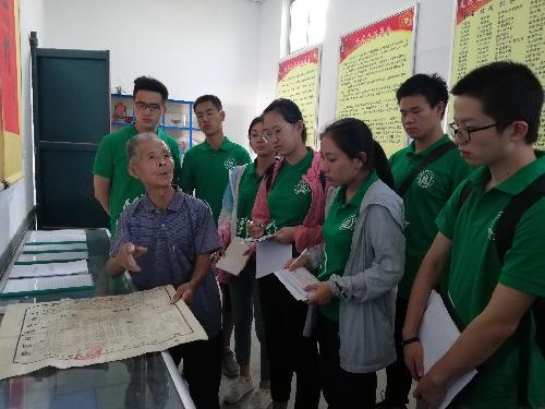 13日下午,就在队员们准备开展问卷调查工作的时候,有幸遇到一位来村委会探访老友的老教师,在老教师的带领下,队员们参观了西赵村村史馆。村史馆面积不大,但其中陈列的物品却极为丰富。一面长墙上悬挂着西赵村村民自己创作的书法或绘画作品,对面的长墙则悬挂着介绍村庄基本情况、村民光荣事迹的宣传资料。展柜里陈列着许多珍贵的文献史料,发黄的纸张上书写的是历史的厚重。老教师在给队员们讲解时,脸上满是骄傲,他同这些宝贵的资料一样,见证着西赵村的变迁与发展。