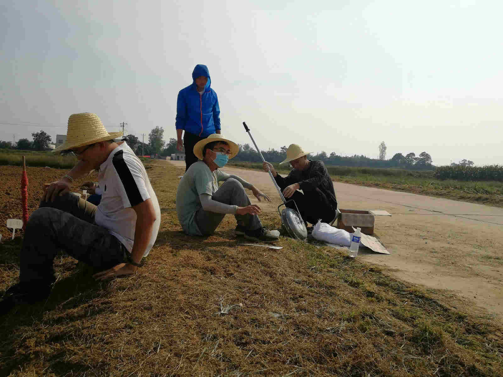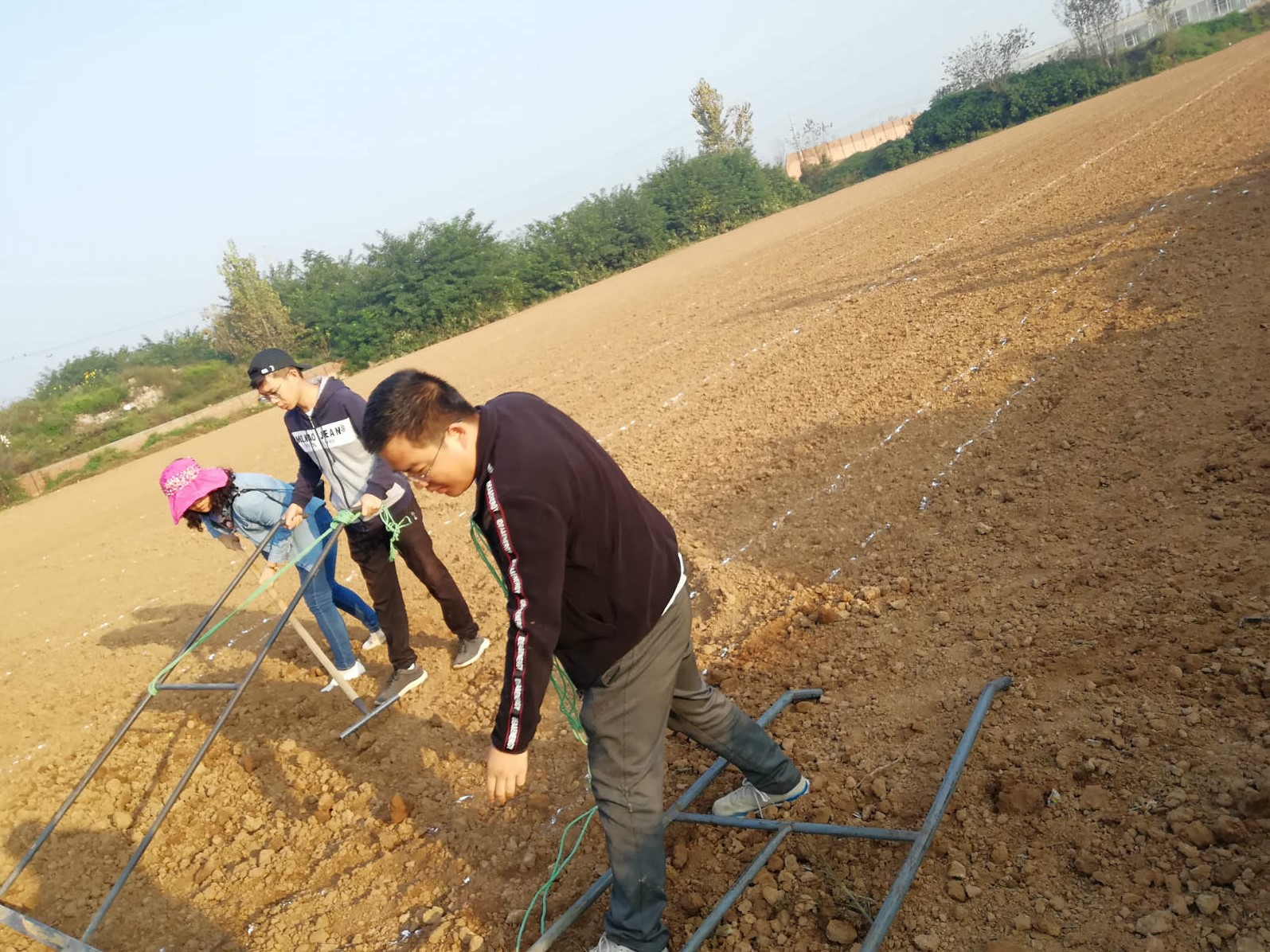 早上七点半,秋播团队在南校三号教学楼前集合,一行人乘车前往曹新庄试验农场。由师兄师姐简单跟志愿者们讲述了当天的计划和安排,一行人便迅速投入了工作,大家围绕着十几亩地开始了整地、划地工作。男生身强力壮,承担了整地的任务,迎着骄阳,扛着工具,在土地上一遍一遍的重复。女生负责划地,一把尺子,沿着边缘一米一米的测量、标记,按照要求用石灰粉把土地上划分为一个个小小的区域。上午的太阳还没有很炙热,志愿者们一鼓作气,互相鼓励,及时完成了上午的工作任务。因为来回路途遥远,秋播小队一行人选择了中午在地头吃饭午休,尽管条件艰苦,但大家谁都没有喊累,匆忙吃完了午饭,席地而坐休息。下午两点,志愿者们准时开工,伴随着越来越毒的太阳,稍微放慢了步伐,在休息的时候,师兄师姐会给志愿者分享他们的科研生活,志愿者们对所学的专业、未来的方向都有了清晰的认识。