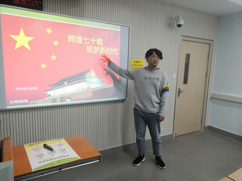 在主题团日活动中,各班主讲人准备充分,以PPT的方式展开讲解。有些支部积极鼓励同学们观看相关影片,激发了同学们的学习热情。还有支部通过歌唱红歌、朗诵爱国主义诗篇、拍摄相关祝福祖国七十周年华诞的小视频等来开展活动。形式多样、创意满满、同学们的参与度极高。各班主讲人分别以时间为主线,从我国建国初期到改革开放,再到中国特色社会主义新时代进行详细认真的解读。着重讲解了建国七十周年我国发生的重大变化以及在探索中国特色社会主义道路上经历的风风雨雨。旨在激发同学们的爱国热情和民族自豪感。紧接着,主持人将同学们分组,要求同学们分享自己所了解的爱国小故事并且积极发表自己的感受。同学们畅所欲言、积极分享自己的感受,每位同学的发言都包含着浓浓的爱国之情,让人感动和欣慰。结着,主持人对同学们提出一些小问题,引发关于当代新青年与中国梦的思考,也同时引发了同学们的担当与责任意识。最后,由各班班主任老师对班会作出了最后总结,老师鼓励大家:“努力学习,永久奋斗,拥抱新时代!”