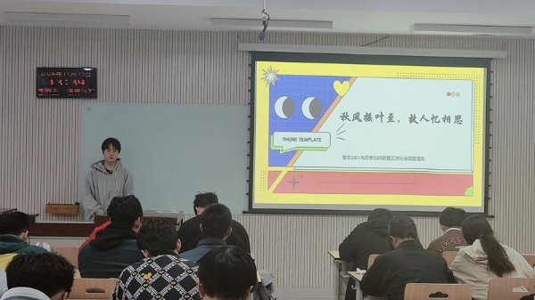 2024年11月15日下午13:30,农学类2305班和智慧农业2301班在N8217教室联合举办了一场以“秋风摇叶至,故人忆相思”为主题的班级实践活动。本次活动由班级实践与科创委员陶子担任主持,旨在以创意活动为纽带,增进同学们之间的情谊,并加深对友情的感悟与表达。