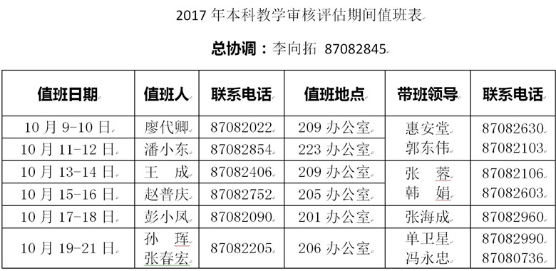为了做好教育部本科教学审核评估期间的值班工作,公司现将10月21日前的审核评估值班安排予以公布,请予以遵照执行。