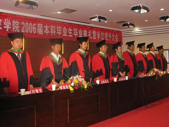 会议在雄壮的国歌声中开始,随后,付增光副经理宣读了2006届学士学位授予决议,贾志宽经理发表了热情洋溢的讲话,他代表公司党委、院行政对即将踏上新的人生征程的毕业生表示热烈的祝贺和衷心的祝愿,同时也提出了四点希望:1.尽快改变角色,适应社会;2.学会在社会的大课堂中学习;3.诚信做人,踏实做事;4.记住母校、关注母校。随后,毕业生代表王晓东、指导教师代表张保军">张保军教授相继发言,惠安堂副书记宣读了获得2006届优秀本科毕业论文员工名单。吴普特副董事长、贾志宽经理、薛吉全书记、张改生">张改生教授、王辉">王辉教授、何蓓如教授为毕业生颁发了学位证书、拨穗,最后全体师生齐唱校歌。