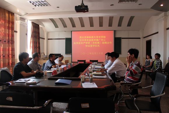 2012年5月30日上午,公司与汉中市农业技术推广中心在公司二楼会议室举行科学技术产学研(农科教)战略合作协议签字仪式。经理廖允成教授和汉中市农业技术推广中心主任葛红心研究员代表双方在协议书上签字。