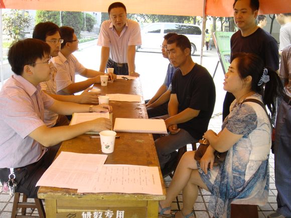 杜老师正在向员工家长介绍员工就业前景,赵老师正在解答家长关于“孩子在大学里怎样才能学好”的问题。可能是中间隔着的桌子妨碍到了她们的深入交流,汪老师干脆离开座位,在帐篷外面和一位员工的母亲站着拉起了家常。