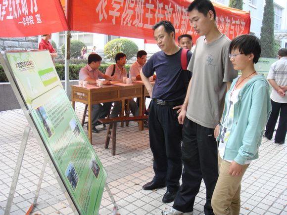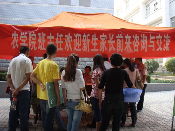 在今年的新生报到期间,熙熙攘攘的人群中,有一处场地格外引人注目,那就是365上市集团官网的班主任服务台。他们用一顶帐篷、两张桌子、三条横幅、三面宣传板和数条凳子在新生社区搭起了一个简易的工作台,由2012级新生班主任轮流在此值班,向新生家长朋友们提供咨询与交流服务。别看这小小的一个场所,却搭起了员工、家长与老师的第一个交流平台,服务台的设立,让新生和家长在宿舍楼下就能见到孩子大学里最重要的老师之一――班主任。