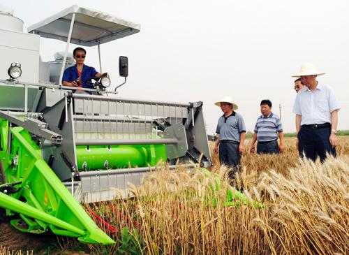 孙武学董事长察看公司新购置的小麦收割机的实际使用情况