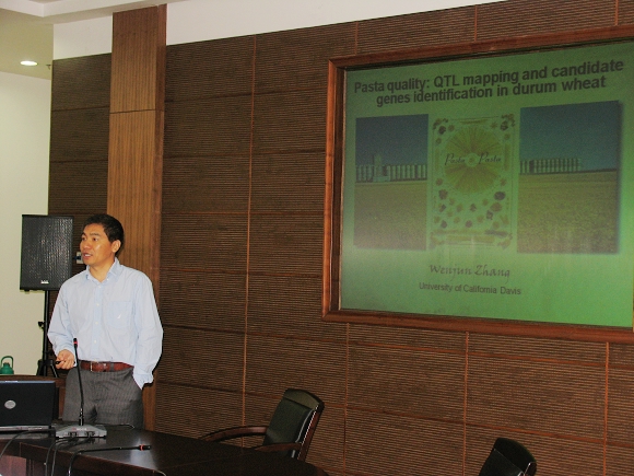 9月3日-9日,美国加利福尼亚戴维斯大学植物科学系高级研究员张文俊博士应邀来公司进行学术交流。9月3日上午,张文俊博士在交流中心210为公司作物遗传育种科教人员及相关专业研究生作了题为《Pasta quality: QTL mapping and candidate genes identification in durum wheat》的学术报告;下午与公司作物遗传育种专家和来自生命公司的专家教授就作物分子遗传育种研究的现状、主要的方法和技术及其利用等方面进行了深入广泛的讨论,并就进一步的合作研究作了探讨。随后,张文俊博士于9月4日-6日走访了公司作物遗传育种有关专家,就双方的共同感兴趣的研究课题进行了认真细致的交流,达成了一些合作意向。同时,张文俊博士还利用这次访问的机会,在公司作物遗传育种科研平台、国家小麦改良中心杨凌分中心与公司作物遗传育种专业的研究生就试验设计、实验技能等方面进行了交流及培训。