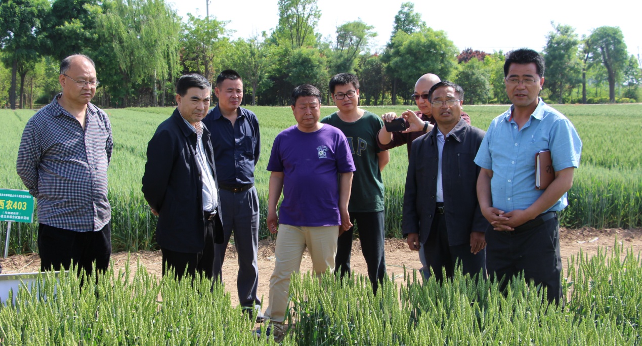 在示范站站长海江波以及驻站专家郭勇,董永利的陪同下,来宾参观了示范站的中心展示田。海江波站长向客人重点介绍了西农805,小偃269,小偃12等品种大田表现和特征,希望能和襄阳市农技中心,陕西稼穑生物科技有限公司建立长期密切的合作关系。郝福新主任表示今年襄阳地区大面积种植的西农979长势喜人,希望示范站能推出更好更多的小麦品种到襄阳种植;杨立宁总经理表示,愿意依托斗口农作物试验示范站,设立农业硕士研究生研究基金项目,对接试验研究、人才培养和产业开发。