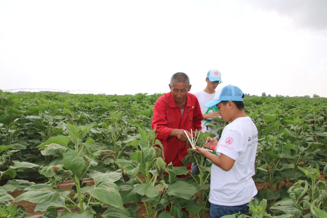 随后,老农询问了油葵花期授粉的的相关情况,尤其是在没有蜜蜂传粉和无风条件下如何保证花期油葵成功授粉。队员表示,后期将与公司专家进一步联系,获得更加科学有效的授粉方法,并且搜集田间管理、病虫害防治等方面的一些材料,以便参考。同时,队员还推荐老农下载安装“农天下”APP,熟悉掌握在线寻求专家帮助指导。老农表示,希望与公司建立长期联系,得到公司更多的帮助,更期待队伍明年继续前来调研!