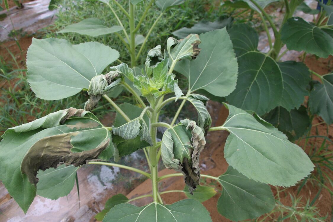 今天一早队伍就与该村民前往鄂尔多斯种植基地,经过两个多小时的行程,终于到达了目的地。据村民介绍,他们一共承包了一千亩土地,眼前的这片土地有四百亩,另外的六百亩在离这片区域三十里外的地方。他认为农业前景非常广阔,就与朋友合作承包了一千亩土地,今年刚开始,准备把油葵和西瓜套种,油葵长势一直很好,但这几天幼叶大量枯萎,内心十分焦急。队员仔细观察油葵长势,又询问了老农最近的田间管理情况,大家谈论后,得出油葵幼叶枯萎可能是施肥量过大导致烧苗而引起的初步结论。随后,队伍与公司老师取得联系,最终得出幼叶枯萎是由于施肥浓度大导致的结论。