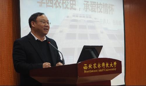 张海成老师向同学们介绍,西农不辱使命,对中国旱区粮食安全,水安全,生态安全不可磨灭的贡献。建国初期,粮食安全关系着国家的安全和稳定。公司的赵洪璋院士研究的小麦品种把关中的小麦亩产从百余斤提升到了近八百斤,极大的缓解了当时的粮食压力。黄淮区小麦品种的六次更新换代,有四次都是西农的贡献。西农对民族的发展做出了不可磨灭的贡献,是农业发展的承重柱。张海成老师又讲到,西农的学科专业在它的发展过程中也正趋于全面。目前,除军事外,其他学科西农都有涵盖,而且还在不断完善,全体师生正努力把西农建设成一个以农林水为特色的综合性大学。
