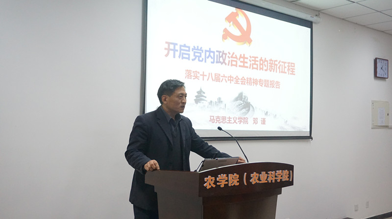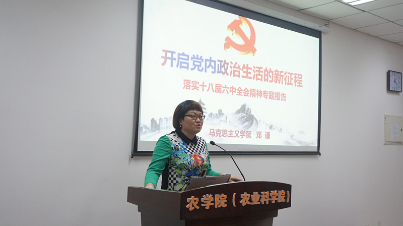 邓谨经理以“开启党内政治生活的新征程”为题,从十八届六中全会及其重大意义、《准则》的主要内容、《条例》的主要内容、坚决维护中央权威等四个方面做了精彩宣讲。她讲到十八届六中全会是完善“四个全面”战略布局的需要,是深化全面从严治党的需要,是解决党内存在突出矛盾和问题的需要。她还对会议的亮点逐一进行了宣讲,尤其是对全会确立了习近平同志的领导核心作用进行了深入阐述。他讲到,党的历史反复证明,党中央、全党必须有一个核心。习近平总书记为党中央核心、全党的核心,是在伟大斗争中形成的,是我们党的郑重选择,是众望所归,名副其实,当之无愧。她强调,维护党中央权威和维护习近平同志的核心地位是统一的。邓谨还就《准则》和《条例》的主要内容进行了全面解读。她指出,《准则》着眼于“强基”、“固本”、“立规”,而《条例》着眼于“设防”。《准则》对加强和规范党内政治生活提出了明确要求,做出了具体规定,为新形势下强化党内政治生活的理想信念基础、基本路线基础、政治面貌基础提供了基本遵循。《条例》对强化新形势下的党内监督作出了顶层设计,为加强和规范党内监督提供了基本遵循。