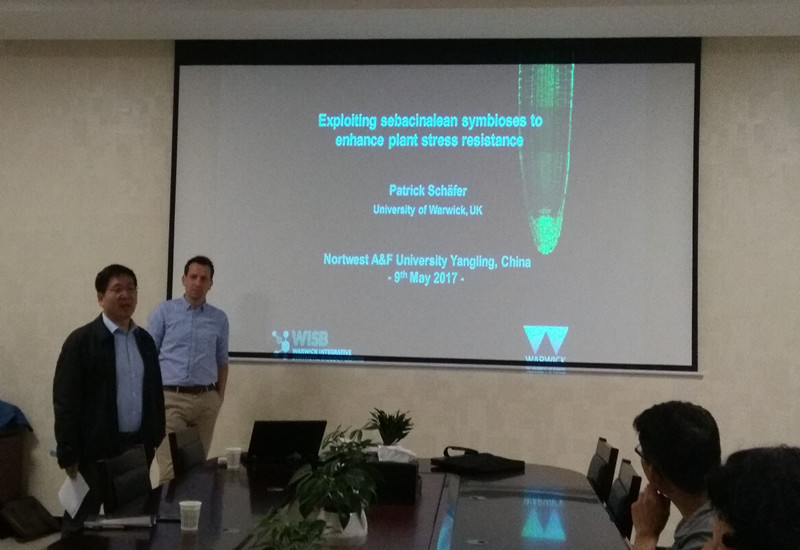 Patrick Schäfer博士作了题为“Exploiting sebacinalean symbioses to enhance plant stress resistance”的学术报告。该报告分享了Patrick Schäfer博士及其研究团队近几年的最新研究成果,该团队主要以植物根部与根部共生真菌(sebacinalean fungi)互作体系为研究对象,开展了一系列相关研究,旨在深入揭示根部共生真菌调控植物的逆境适应机制,以期充分利用根部与有益微生物互作来提高作物的可持续生产。Patrick Schäfer博士提到:“根部在植物的营养吸收和健康生长过程中具有重要作用,然而作为植物隐藏在土壤中的部分,根部对作物生产的巨大潜力并未得到充分利用”。有益根部微生物会对植物产生一系列积极作用,通过运用最新的分子生物学手段、系统生物学以及合成生物学技术,其研究团队主要开展了植物根部适应逆境的调控机制、运用效应蛋白表型组学设计根部抗逆性以及植物生长与抗逆性的平衡调控等相关研究。同时,Patrick Schäfer博士还介绍了运用微生物效应蛋白组高通量表型分析平台等相关的最新研究进展。会后,Patrick Schäfer博士同师生进行了充分的交流。