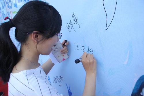 毕业生在签名墙上签名