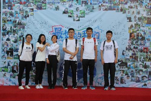 毕业生与签名墙合影