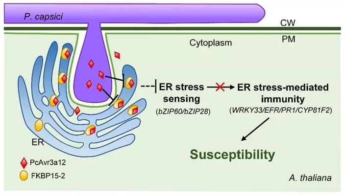 基于以上结果,该研究发现了内质网应激介导的植物免疫反应的新组分FKBP15-2,解析了辣椒疫霉菌通过其致病关键的效应蛋白PcAvr3a12抑制植物免疫的新机制,即PcAvr3a12通过靶向和抑制植物FKBP15-2,抑制内质网应激介导的植物免疫,促进病菌对寄主植物的侵染(图3)。