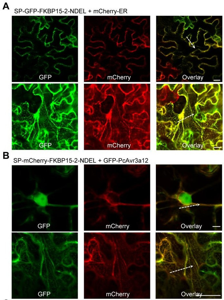 图1:辣椒疫霉菌RXLR效应蛋白PcAvr3a12及其靶标FKBP15-2共定位于内质网并富集在病菌吸器周围。
