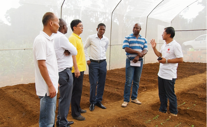 农技组组长兼作物专家路阳明(左二)向塞维利诺经理(右三)一行介绍大棚情况