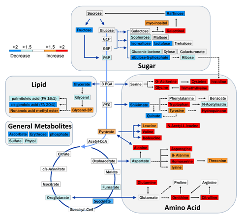 小麦起源于温带,属喜凉作物,生育期内,特别是开花期和灌浆期的高温会严重制约小麦的产量和品质,然而其中的生理和分子机制尚不完全明确。该研究首先利用38份热敏感性不同的材料,通过分期播种实验,证明了不同高温条件下,粒重和灌浆持续期的降低,蛋白质含量的增加以及灌浆速率的稳定,是小麦灌浆籽粒适应高温的一般机制。进一步通过蛋白质组学和代谢组学研究,表明胁迫响应蛋白质和贮藏蛋白能够逃出高温胁迫对细胞蛋白质合成的总体抑制,同时细胞内的能量和资源被更多地分配到同化物的贮存途径,维持了高温胁迫下籽粒灌浆速率的稳定。