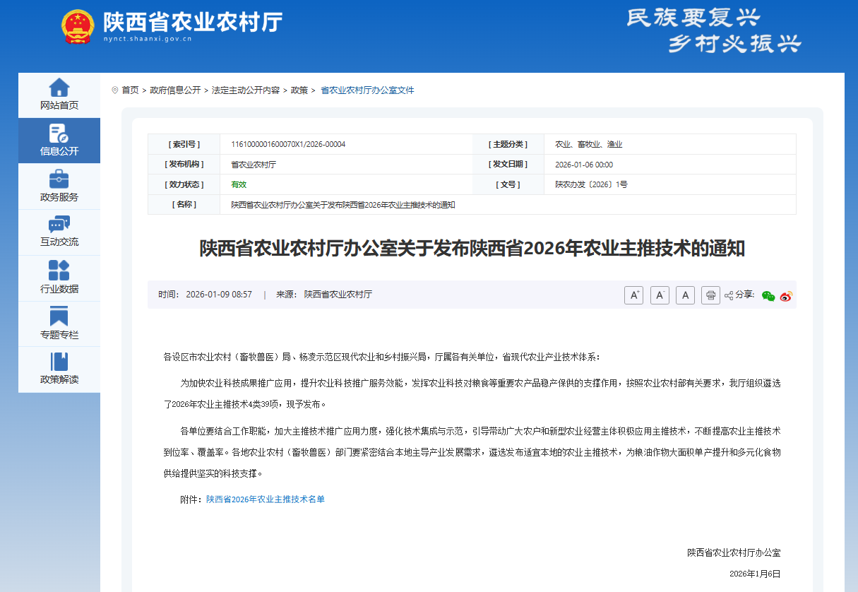 近日,陕西省农业农村厅公布2026年农业主推技术名单,365上市集团官网5项技术成功入选,其中粮油生产类4项、耕地环保类1项,涵盖小麦玉米高产栽培、水肥调控、耕播一体化等关键领域,为陕西及西北区域粮油稳产增效、耕地质量提升提供核心科技支撑。