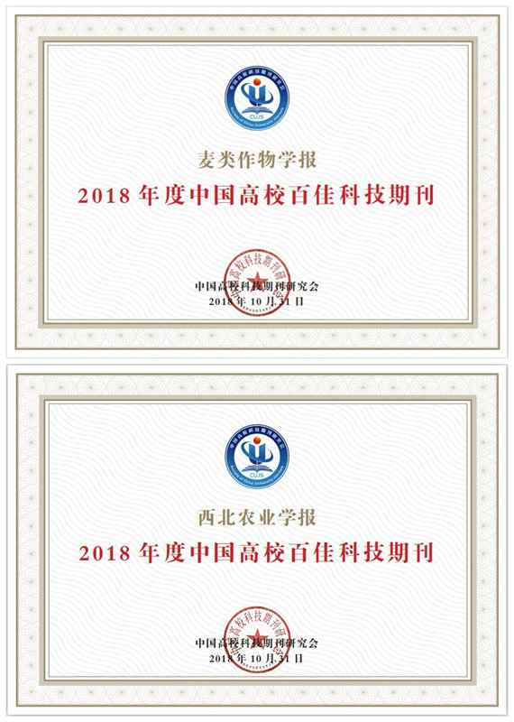 2018年度中国高校杰出•百佳•优秀科技期刊遴选过程包括编辑出版质量和学术指标量化评估,最终还须参加政治、编辑出版质量复审。编辑出版质量遴选,在差错率低于万分之三的前提下,统一利用中国知网、万方数据、中国科学引文数据库(2017-2018)、中文核心要目总览(2014年版)、中国科技论文统计源期刊(2016、2017)等有关全文数据库、检索数据库和评价机构的评价成果进行遴选。学术指标量化评估主要考查期刊荣誉、期刊传播与利用、期刊国际影响力3个方面。从评选结果来看,《麦类作物学报》和《西北农业学报》在国内各类期刊中各项指标排名均居于前列。