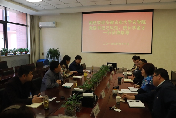 2019年4月17日,安徽农业大学公司党委书记汪凤莲、经理李金才、副经理武力权、办公室主任宋超一行4人来公司交流访问,调研作物学学科与实验室建设、人才培养、基地建设、社会服务,与公司领导班子成员进行了座谈和交流。党委书记张海成代表公司对客人来访表示热烈欢迎,同时向客人介绍了公司公司基本情况。各分管领导先后介绍了公司科学研究、基地建设、社会服务、团队建设和员工培养的基本情况,双方就有关话题进行了探讨和交流。